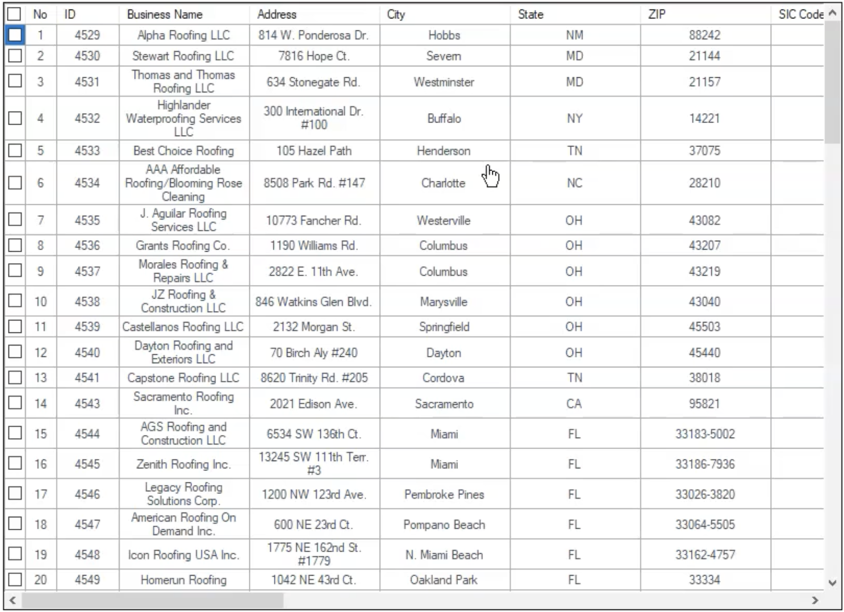 Search new businesses by type (e.g. roofing, dental, legal) and own the data or message directly.